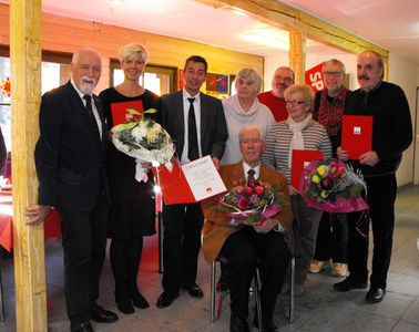 Neben Karl Garbe, der bereits von einer Delegation des Ortsvereins in Bonn geehrt wurde, gab es noch weitere Jubilare. Hans Pfaff wurde für 60 Jahre Parteizugehörigkeit geehrt, Richard und Irene Gutt für 40 Jahre. Ilona Katemann blickt auf eine 10jährige Mitgliedschaft zurück. Nicht dabei waren Irene Weber für 40 Jahre Parteizugehörigkeit und Mathias Schröter für 10 Jahre Parteizugehörigkeit.
